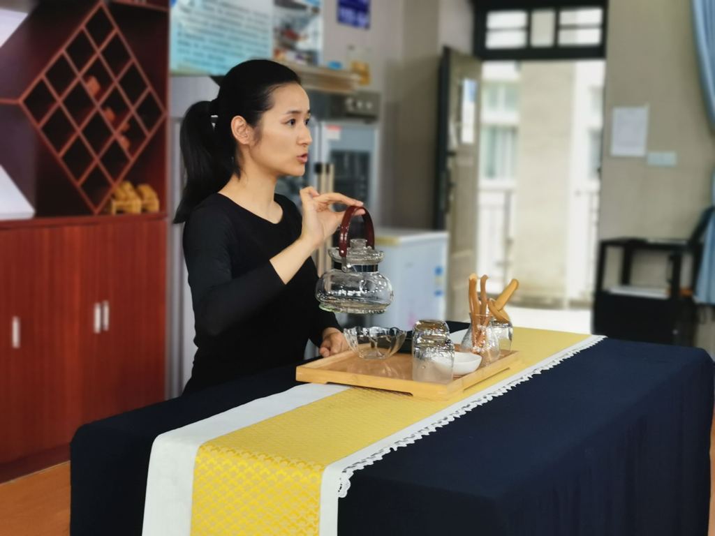 在优雅温馨的茶艺教研室,郁薇老师娓娓道来,从绿茶品鉴、泡茶三要素、茶具套装的组成、玻璃杯冲泡流程四个方面为大家边讲解边示范。大家一边聆听一边实际操作,一套流程下来,收获满满,品尝自己冲泡的茶叶,别有一番滋味。