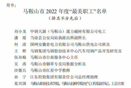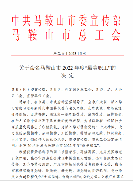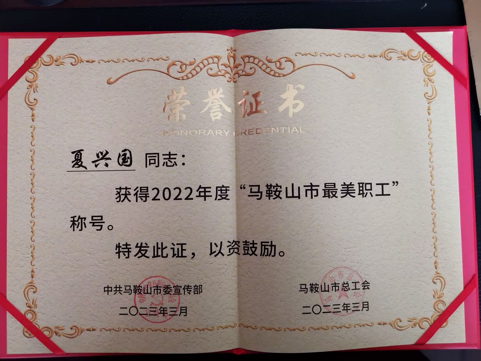 近日,我院教师夏兴国在市委宣传部、市总工会发起2022 年度“最美职工”选树工作中,获马鞍山市“最美职工”称号。本次活动,马鞍山市共评选出20名“最美职工”,这是我院首次获得此项荣誉。